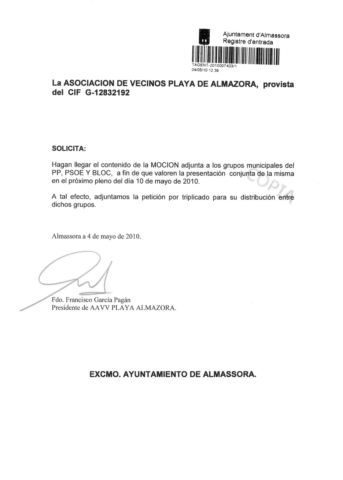 la moción que el dia 4 presento en el Ayuntamiento de Almazora en la